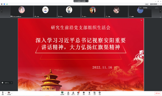 为深入学习贯彻党的二十大精神和习近平总书记视察河南安阳重要讲话精神,11月16日晚,研究生前沿党支部通过线上腾讯会议的形式,以“深入学习习近平总书记视察安阳重要讲话精神,大力弘扬红旗渠精神”为主题召开专题组织生活,党支部全体党员、预备党员参加学习交流。