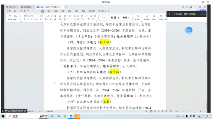 闫丽霞对于与会老师对学院建设工作的支持表示感谢。与会老师作为学院的骨干教师和中坚力量,这种有担当、肯奉献的精神给其他青年教师树立了榜样,也在学院内营造了攻坚克难、干事创业的氛围。她指出专业建设要明确培养特色,紧密结合社会需求,培养社会需要国家需要的人才,规划时要有大局观,综合考虑学生培养、招生、教学条件、师资建设等多个因素。她强调广大教职工应该以学院的发展为己任,结合党的创新理论,在党建引领下高质量稳步发展。