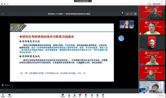 包教授从各个方面讲解了作为研究生导师的岗位职责与专业素养,导师们表示受益匪浅。研究生导师肩负着为国家发展、社会进步培育时代新人的崇高使命,应具备高尚的师德师风和专业伦理规范,同时具备优秀的学科专业知识与技能、教育教学知识与指导能力、组织管理与协调能力、自我发展与提升能力。作为新时代的研究生导师,在指导学生过程中更要做到自主、自觉反思,更好地应用到实践中去。