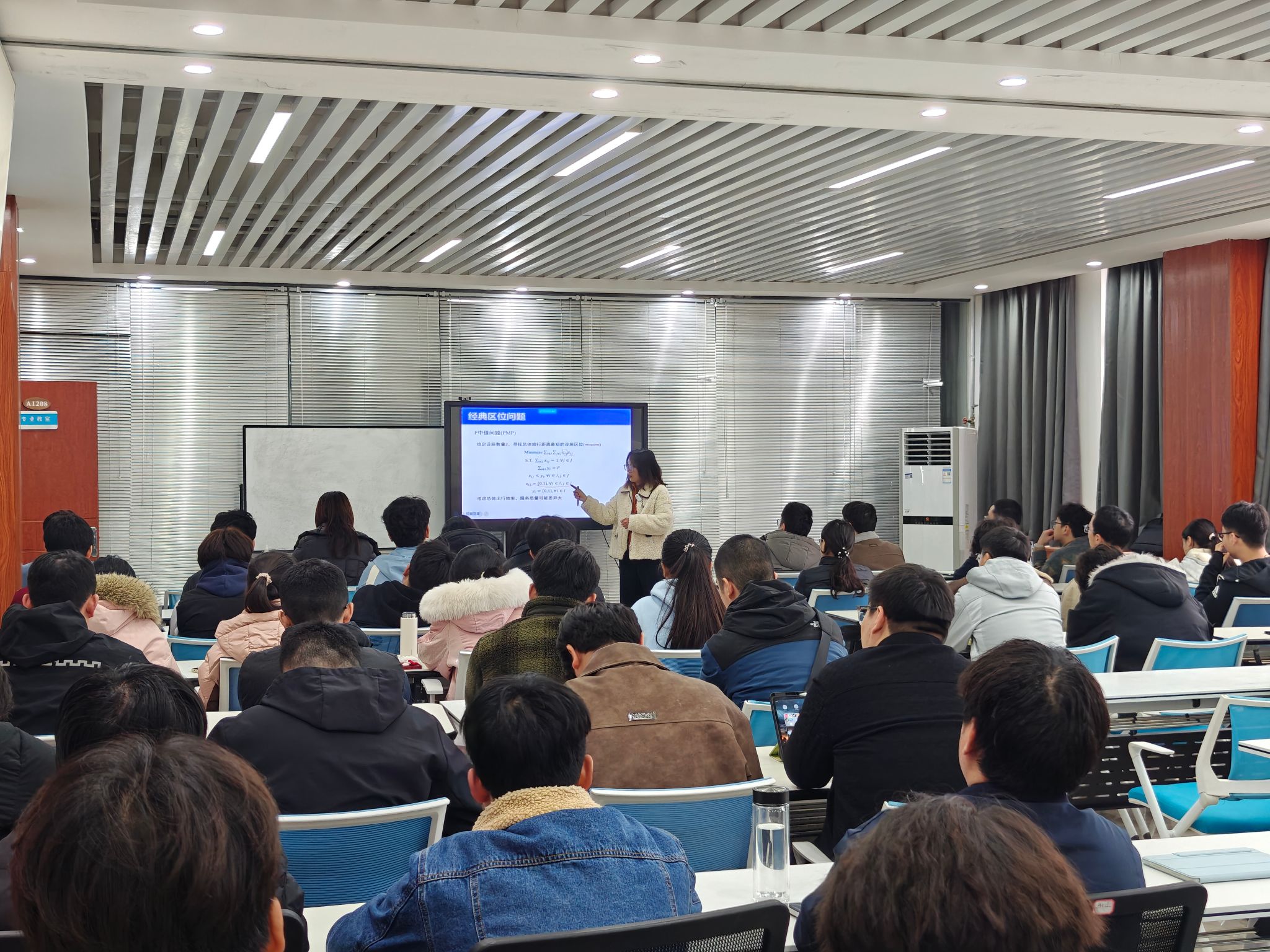 论坛上,连晨晨作了题为“经典区位问题介绍”的报告。报告围绕经典区位问题、部分覆盖问题及典型应用三部分展开,内容详实。她首先梳理了区位集覆盖、最大覆盖、P中值、P中心等经典模型的核心思想与求解方法。随后介绍部分覆盖问题,对比分析与传统模型的差异,并阐释了数学求解器(如Gurobi、CPLEX)与数学启发式算法等求解方法。最后结合应急、公共服务、管理规划三大领域,分享了消防站选址、社区养老中心规划等案例,体现了理论研究的实践价值。报告中模型与方法可拓展至网络安全领域(如关键信息基础设施防护),引发师生对未来跨领域应用的深入讨论。