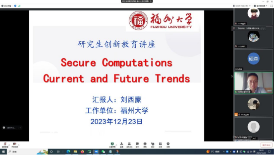2023年12月23日下午两点半,福州大学刘西蒙教授应前沿信息技术研究院邀请,以线上会议的形式,作了“密态计算理论与应用”的讲座。讲座由av视频app 副院长潘恒主持,全体研究生参加。