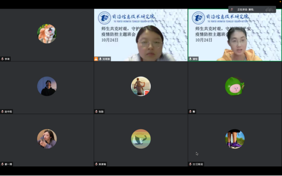 近期,疫情呈多点散发,形势严峻。为进一步强化学生遵规守纪意识,筑牢安全防范思想防线,av视频app 于10月24日晚8点召开“师生共克时艰 守护校园平安”疫情防控主题线上会议,副院长潘恒、研究生秘书刘长慧以及全体研究生参会。