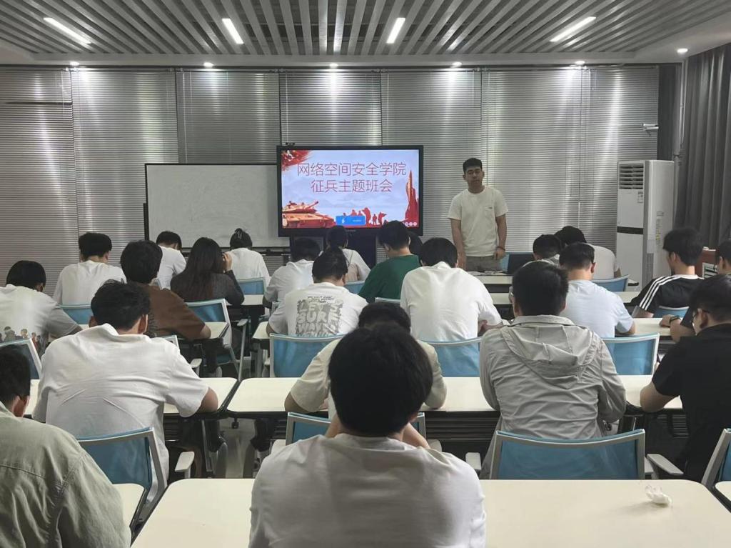 于2024年7月2日在1208教室召开征兵动员主题班会,此次班会由辅导员郭政良主持,全体研究生参加。