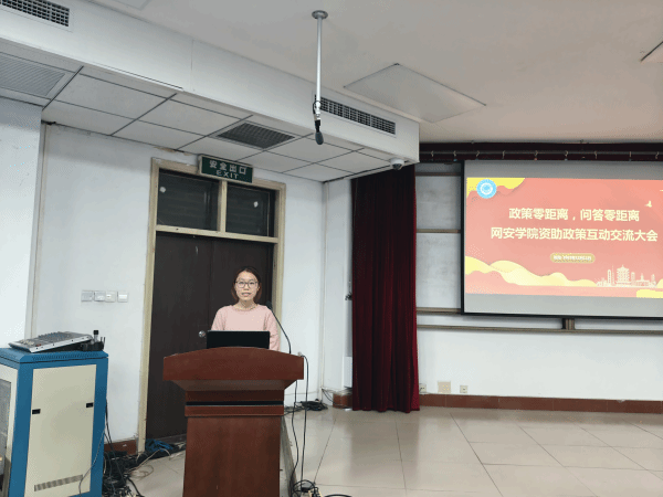 在12月11日于4号教学楼311报告厅举办“政策零距离,问答零距离”资助政策互动交流大会,2024-2025学年国家励志奖学金获得者代表梁金伟与禹青莉担任本次大会的宣传大使,全体本科生参加。会议由学工办副主任郭政良主持。