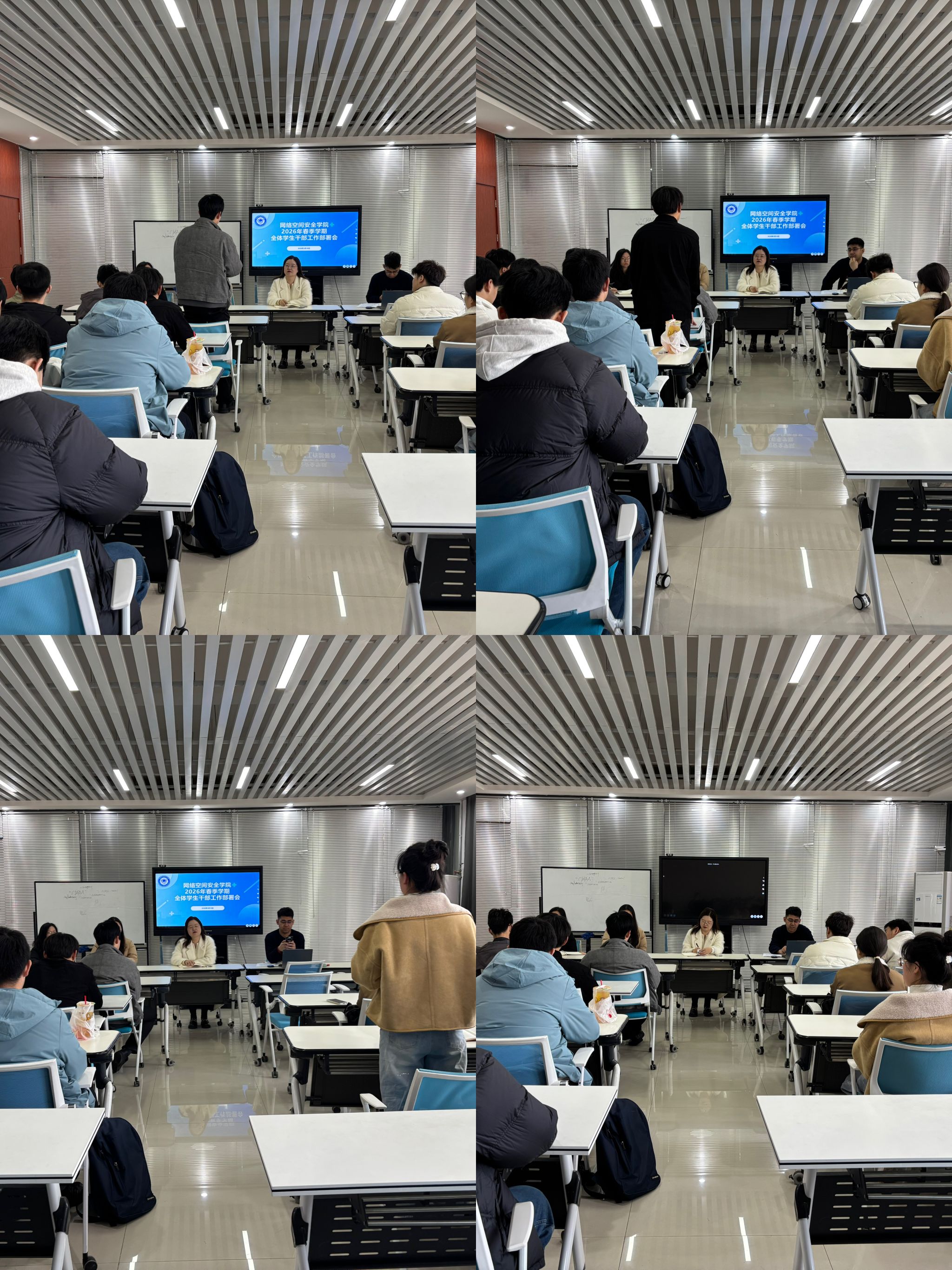 随后,学生会负责人李亦丰、团委负责人荣雨晨、青总负责人周宇依次部署本学期重点工作:学生会明确日常考勤、课堂秩序及宿舍安全检查细则;团委聚焦思想引领、团学联动工作;青总围绕志愿服务与实践拓展开展安排。本硕各班班长也结合班级实际,依次汇报了新学期学风建设、日常管理、班级活动等方面的工作计划。大家表示,将认真履行职责,积极配合学院工作,营造团结向上、勤学奋进的氛围,切实为同学们服务。邢颖与郭政良对各组织及各班的工作部署表示肯定,也为优化工作落实提出具体指导建议,为新学期学生工作高质量开展奠定坚实基础。
